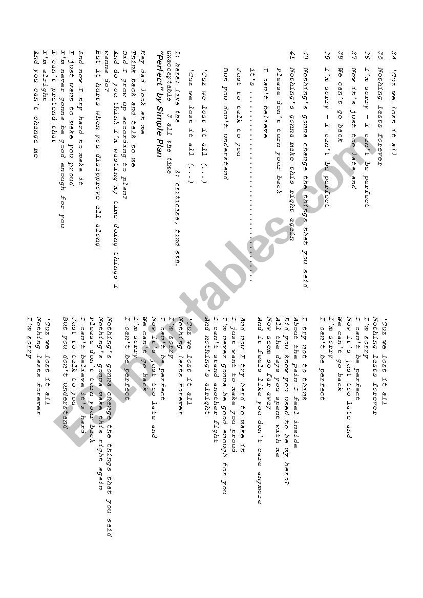 Perfect Song By Simple Plan Lyrics Lessson Plan And Lots Of Activities Esl Worksheet By Elderberrywine
